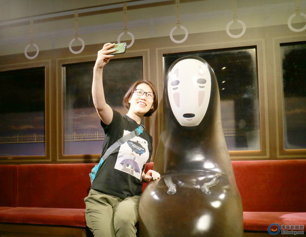 在神隱少女「千尋和無臉男一起搭電車」的場景裡,大家一定很納悶,說好的千尋呢?當然是由大家來擔任這個重要的角色啦,無臉男身邊留了一個位置,要讓大家化身千尋和無臉男一起自拍。不過無臉男怎麼有點奇怪?它不是應該是全身黑的嗎?為什麼看起來有點透明的感覺?日方展場設計總監長香菜子小姐有趣的表示:這是因為它是神秘的幽靈啊!以FRP(玻璃纖維強化塑膠)打造的無臉男,由於這個場景屬於溫馨一點的感覺,因此刻意作成微透明感來營造幽靈神祕又柔和的一面。