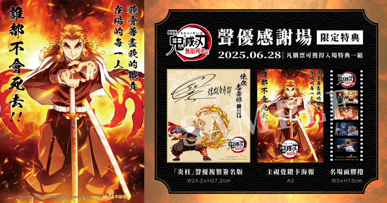 此外,為感謝台灣粉絲長期以來對《鬼滅之刃》系列的支持,動畫代理商木棉花於特別規劃於 2025 年 6 月 28 日舉辦「聲優感謝場」活動,邀請粉絲們重新憶起當年熱血又感動的瞬間,本活動的售票將於 5 月 28 日 中午 12:00 準時開賣,更多詳情可參木棉花粉絲專頁。