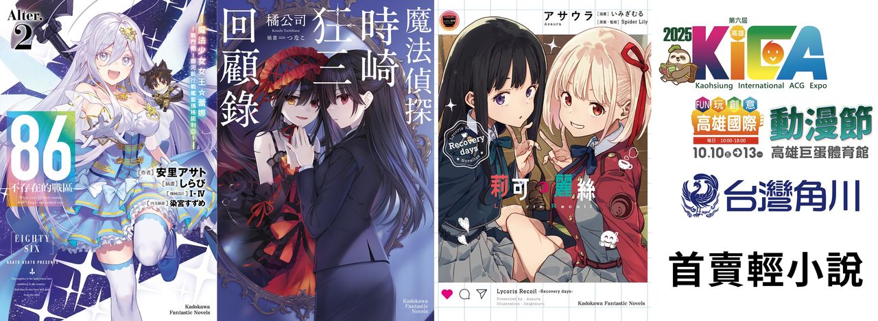 2025高雄國際動漫節將於10/10~13在高雄巨蛋熱鬧登場,台灣角川與尖端、東販三家聯合參展,首賣特裝版共推出四部作品,日本原作邁入最終篇章的熱門話題作《86─不存在的戰區─(Alter.2) ─ 魔法少女女王☆蕾娜~戰鬥吧!銀河航行戰艦聖瑪格諾利亞~ ─》收錄多篇未發表短篇,動畫化超人氣作品首次短篇集系列、《約會大作戰》外傳推理小說《魔法偵探時崎狂三回顧錄》、守護日常的少女特務外傳續篇《Lycoris Recoil 莉可麗絲 Recovery days》以及日本知名耽美漫畫家スカーレット・ベリ子首部全彩條漫話題作續篇《救贖:唯一的永遠 2》。