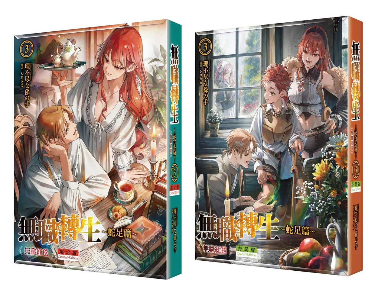 《無職轉生 ~蛇足篇~(3)》限定版以「摯愛相伴的寧靜時光」為主題打造專屬珍藏書盒,收錄特典:完整展現書核封面美感的「布掛畫(含組裝桿)」、三位老婆可愛立繪的「搖搖立牌」、值得紀念展示的「2入拍立得風小卡」以及「限定版8P短篇小冊子(〈菈菈看起來很寂寞〉、〈莉莉撒嬌〉兩則短篇)」;特裝版則是以「家族間的合影」為設計核心,特製書盒呈現魯迪替兒子亞爾斯治療的溫馨畫面,收錄特典:可直立展示全家福的「壓克力桌繪」、以精巧尺寸呈現高質感印製的「迷你無框畫」以及「特裝版8P短篇小冊子(〈露西生氣了〉、〈亞爾斯與商人〉兩則短篇)」。