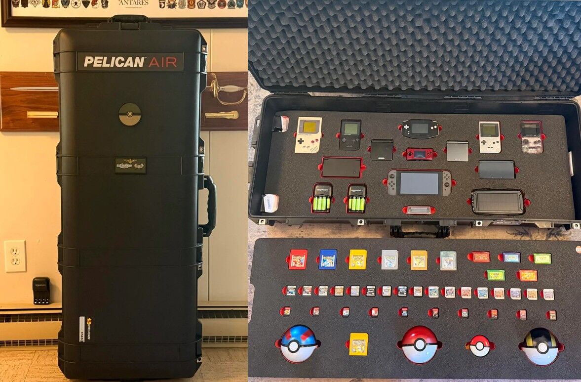 該名玩家將原本用來存放高價相機或槍械的專業防護箱改裝,裡頭完整收納歷代任天堂主機,從早期的 Game Boy 系列,一路到最新的 Switch 全數備齊,同時收藏幾乎所有世代的《寶可夢》實體遊戲,涵蓋自《紅/藍》版本到最新推出的系列作品,為了確保設備能長時間運作,他還準備了大量電池、充電線材,甚至連太陽能板都一併放入箱中。