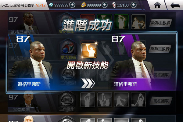 在教練系統中,教練也可進階升級,進階後將直接作用在教練所攜帶的技能和戰術方面,使得技能和戰術更強更有變化性。