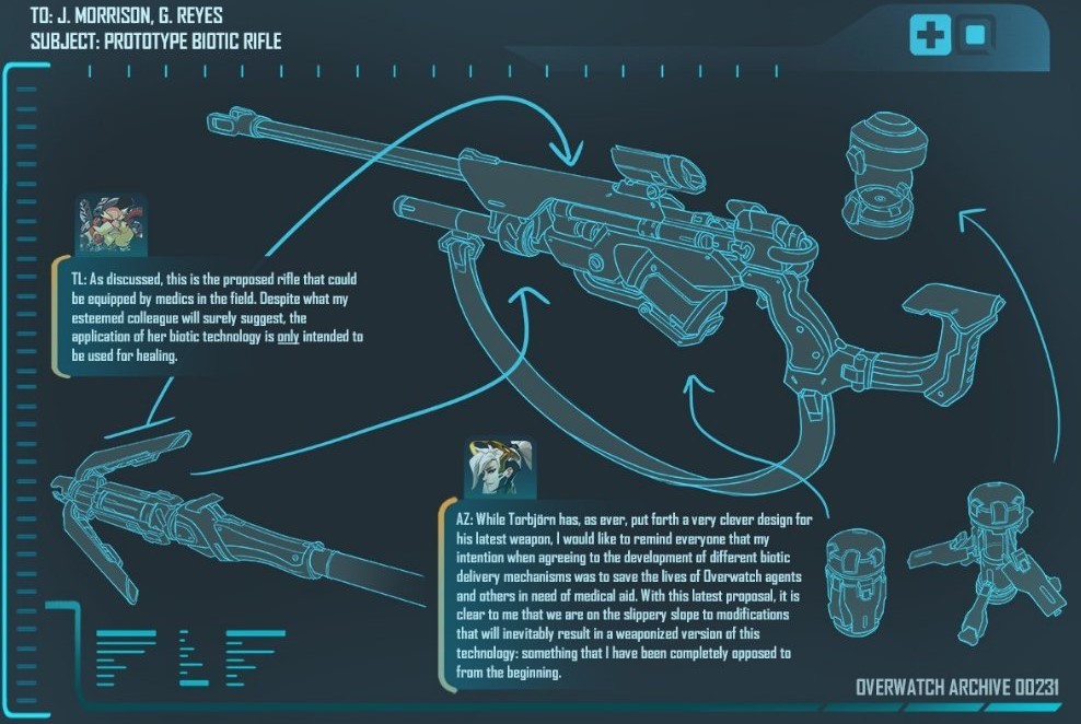 從圖片中可以看出這把武器依舊是由捍衛者陣營的大工匠托比昂打造的,外型看起來是一把狙擊槍,但是似乎又可以變化成類似慈悲的武器。在圖中的文字也提到這是可以由醫療兵帶上戰場所使用的。在遊戲中一些散落的文件中,已經有熟知《鬥陣特攻》的玩家推測出這是一位名為「Sombra(暫譯:桑布拉)」的新英雄所持有的武器。