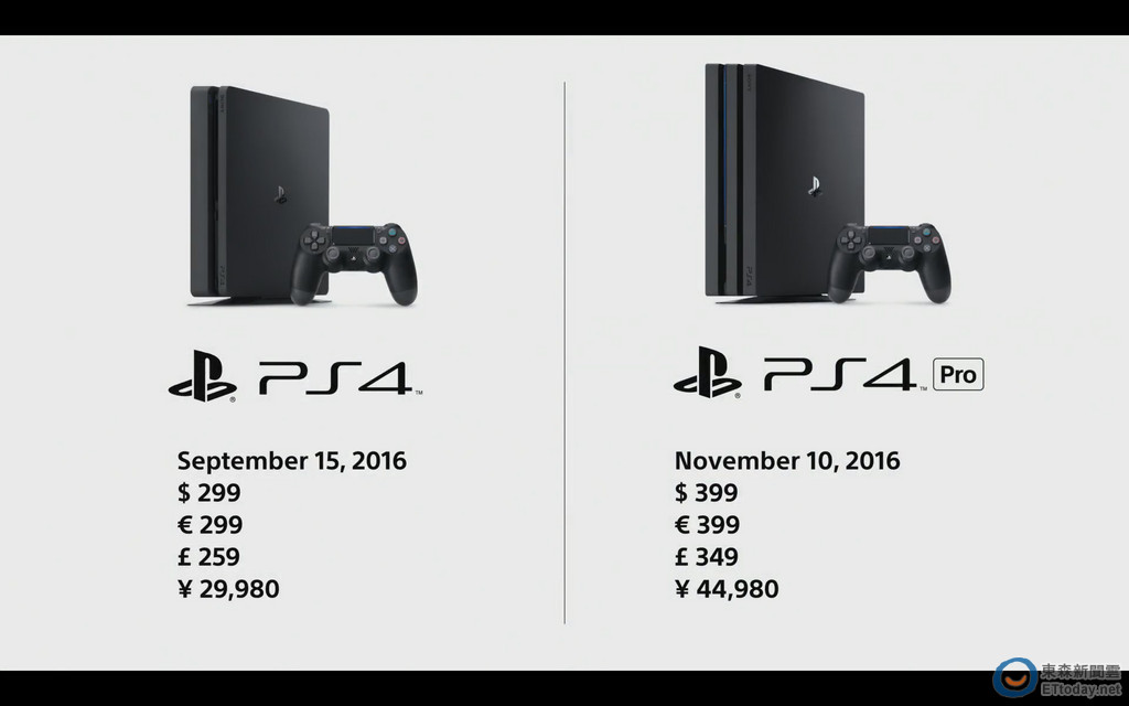 最後Andrew House宣布,「PS4 PRO」將於11月10日正式上市,售價399美金(約新台幣12,369元),外型將類似於PS4的新薄型機,但也更大一些,前端則採三層設計。亞洲區的PS4薄機與PS4 PRO售價將於台灣時間今(9/8)日早上11點的亞洲區直播中發佈。